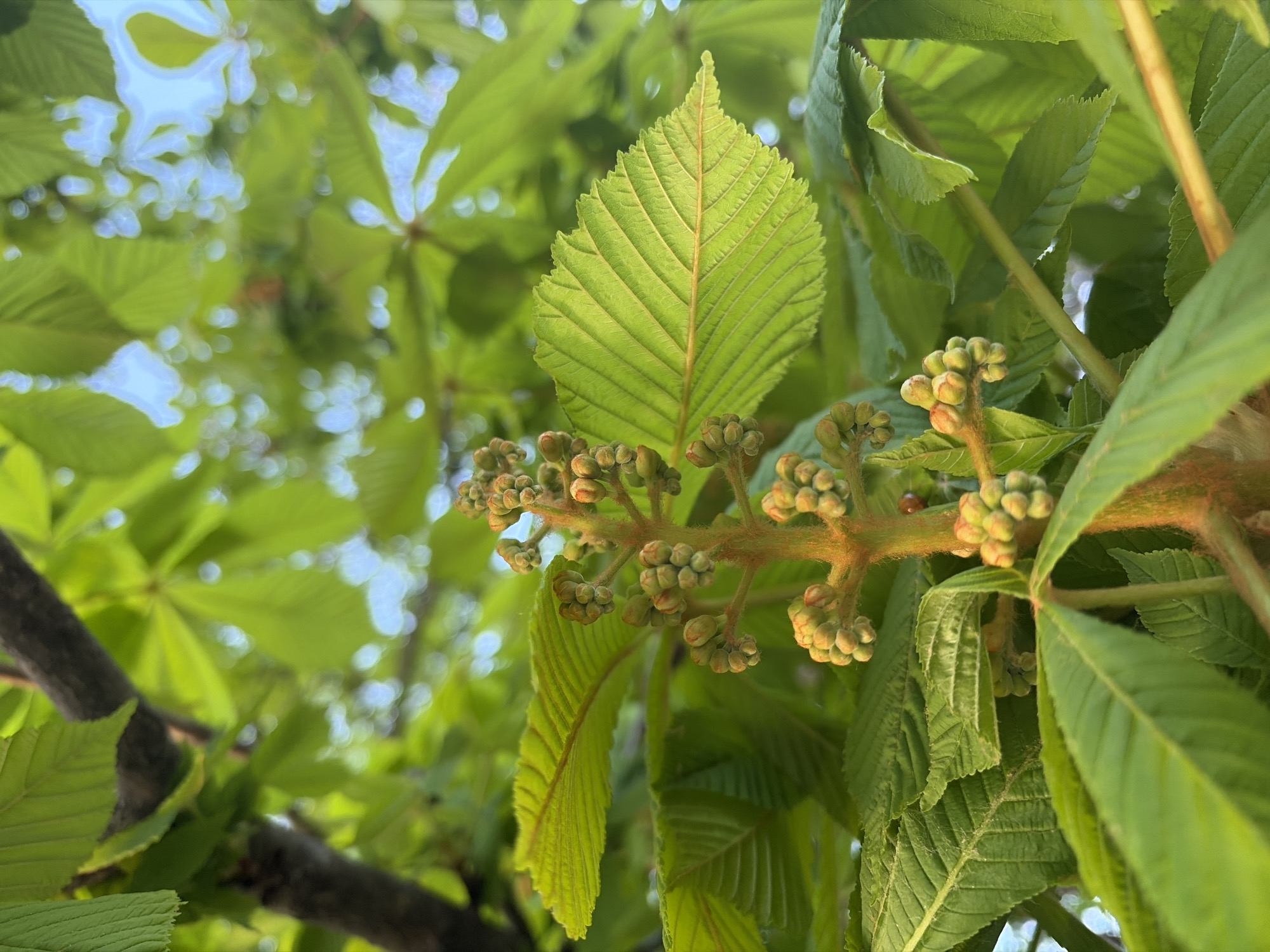 close-up of a tree, specifically a horse chestnut tree. The view is from below, looking up into the foliage. A prominent, light-green compound leaf with serrated edges is centrally positioned. A cluster of small, round, unopened flower buds, likely of the horse chestnut tree, is visible on a reddish-brown branch extending from the right. Other leaves and branches are visible in the background, with glimpses of the sky through the leaves. Given the characteristics of the tree, this photo could potentially be taken anywhere in Sofia, Bulgaria, as horse chestnut trees are common in parks and urban areas.