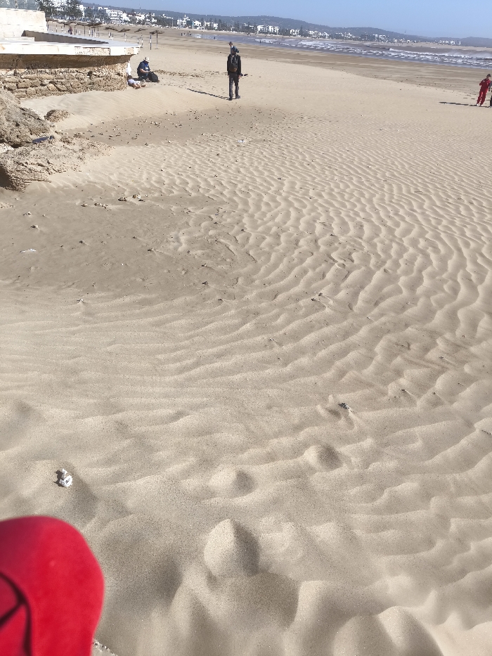 This image depicts a wide sandy beach in Essaouira, Morocco, specifically the main beach facing the Atlantic Ocean under clear daylight conditions. In the foreground, the lower left quadrant shows a partial view of a red object. The sand surface exhibits extensive, well-defined ripples formed by wind action. A small white object, possibly a shell or debris, rests on the sand in the lower midground. Towards the midground on the left, an eroded sandy embankment borders a low stone or concrete wall structure. Two individuals are seated on the sand near this structure; one wears dark blue attire, and the other wears lighter clothing. Further right and central, a lone individual in dark clothing, carrying a backpack, walks away from the camera towards the ocean. On the far right, closer to the waterline, another individual dressed in red stands facing the ocean. The background features the Atlantic Ocean with moderate breaking waves extending across the horizon. Beyond the ocean, a distant coastline with numerous white or light-colored buildings, characteristic of urban development, is visible under a clear blue sky.