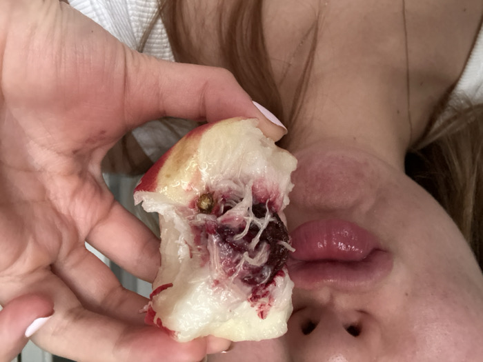 The image displays a close-up of a female subject from the nose downward, holding a partially consumed fruit. The subject's lips are puckered and glossy with a reddish-pink hue. Her skin is fair, exhibiting minor redness on the chin area. Light brown hair is visible on the left side of the frame, draping over a light-colored, possibly white, ribbed garment. Her right hand, with nails painted in a pale shade, firmly grasps the fruit. Small, dark, irregular specks are present on the palm side of the hand's base. The fruit is identified as a partially eaten peach or nectarine, characterized by its white, juicy flesh with visible red streaks and fibrous strands extending from a dark, purplish-red central cavity. A small, light brown, oval-shaped seed or pit fragment is present within this cavity. The remaining skin of the fruit displays shades of reddish-yellow. The background is indistinct and blurry, suggesting an indoor setting with muted, light tones. There are no identifiable landmarks, architectural features, or specific visual cues within the image to suggest the city of Paris, France, as its location.