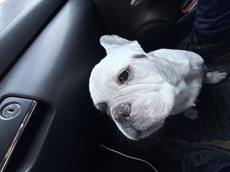 A white French Bulldog, featuring brindle markings above its left eye and on its head, is depicted seated inside a vehicle
