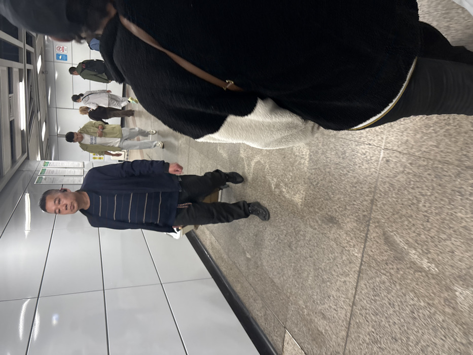 The image depicts an underground pedestrian walkway, likely a subway station concourse, located in Yuexiu District, China. The scene features multiple individuals moving in various directions under artificial lighting. In the left foreground, a middle-aged male with short dark hair walks towards the right. He wears a dark blue zip-up jacket over a dark blue and brown striped long-sleeve shirt, dark pants with a red-patterned drawstring, and dark sneakers. A dark earbud is visible in his right ear. He pulls a small, light-colored, wheeled luggage or cart behind him. In the immediate right foreground, the back of a person is partially visible, walking towards the left. This individual wears a black and white fuzzy or fleece-like jacket and dark pants. A light-brown strap, possibly from a shoulder bag, crosses their back. Further down the corridor, several other people are present. A younger male, wearing a light yellow jacket over a white t-shirt and light grey sweatpants with white sneakers, walks towards the camera. Other figures include a person in a light grey tracksuit walking away and a person in a dark green jacket with a backpack also walking away. The environment consists of smooth, light grey paneled walls with horizontal seams and a dark base trim. The floor is composed of light grey, speckled terrazzo-like tiles, showing some wear. The ceiling features integrated artificial lighting fixtures and dark structural elements. Faint green signage is visible on the distant wall.