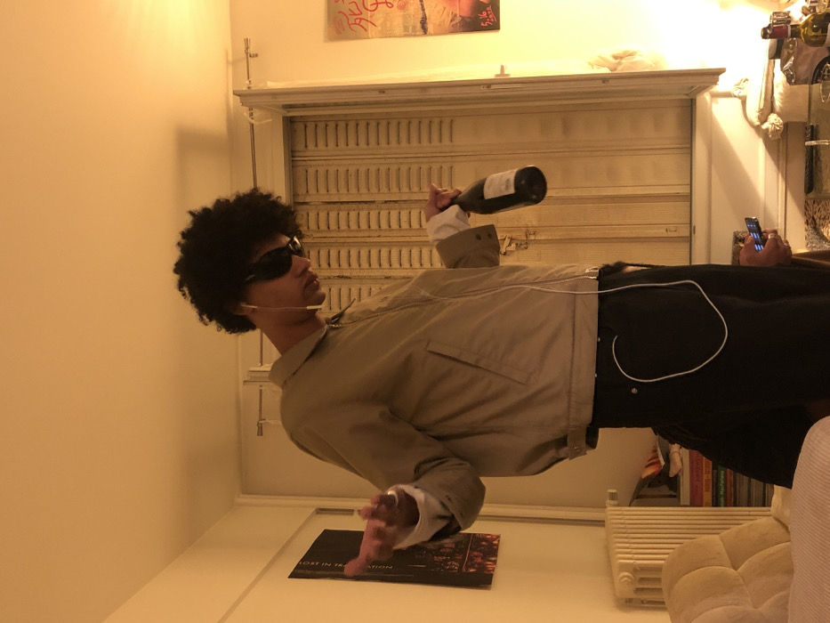 A person with an afro and sunglasses holds a wine bottle and a phone. They wear a light-colored jacket and dark pants. The person is in an indoor setting, likely a room. A decorative window or door frame is behind them. There is a poster or artwork above the frame. A small poster or photograph lies on the floor. A radiator and couch are also visible.