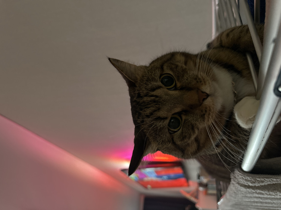 - "A tan and brown tabby cat peers down from a high perch, its head tilted slightly to the left" by FM-kFCat1, licensed under CC BY 4.0