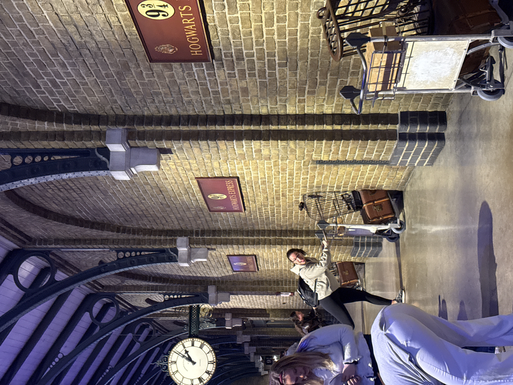 The image depicts an indoor platform setting resembling a Victorian-era train station, specifically designed as "Platform 9 3/4" from the Harry Potter series. This location is identified as the Warner Bros. Studio Tour London, situated in Leavesden, Watford, within the Three Rivers district of Hertfordshire, United Kingdom. The environment features light brown brick walls with dark mortar, supported by dark metal arched beams overhead with decorative circular cutouts. A large circular clock displaying Roman numerals and "LONDON" is suspended on the left, showing approximately 1:50. Multiple reddish-brown signs are affixed to the brick wall, including "HOGWARTS EXPRESS" and a prominent "9 3/4 HOGWARTS" sign. The flooring is a smooth, grey surface. Three individuals are present. In the mid-ground, a female wearing a light-colored hooded sweatshirt, black leggings, and sneakers is actively posing. She is leaning forward with her right leg extended backward, simulating a push through the wall, her mouth open in a grin with her tongue slightly out. She is holding the handle of a metal luggage trolley that appears partially embedded in the brick wall, carrying a brown vintage-style suitcase and a birdcage. In the foreground left, a female with light hair, wearing a light grey top, is partially visible, looking downwards. In the far foreground bottom, the lower back and legs of a person in light grey pants are bent forward. A second metal luggage trolley, loaded with a brown suitcase and wooden boxes, is visible in the foreground right.