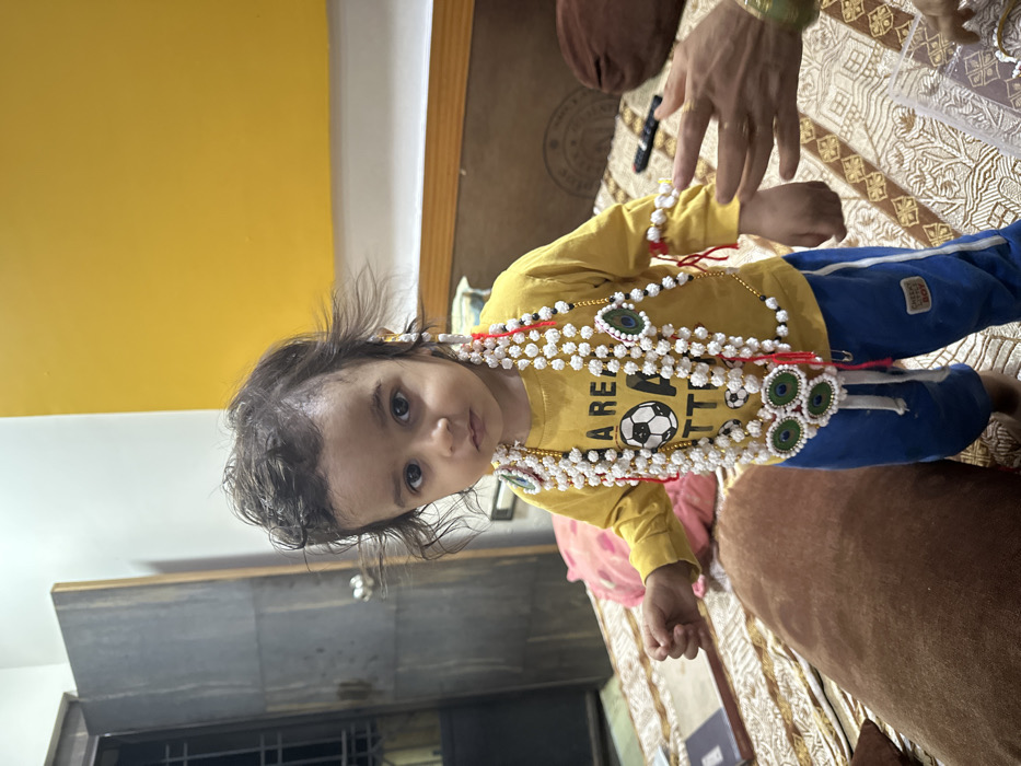 In Shahapur, India, an indoor scene depicts a young child standing upright on a patterned bedspread