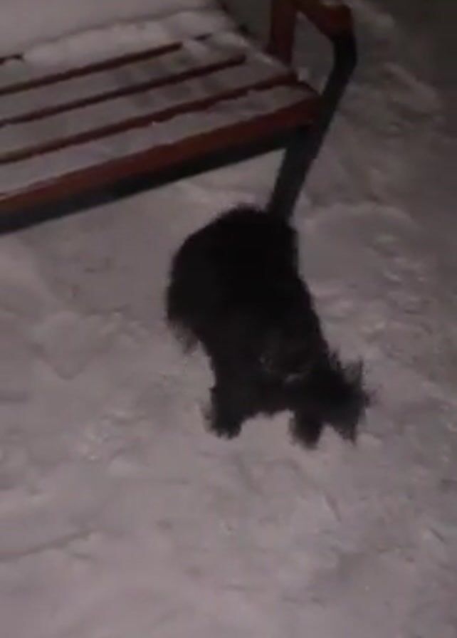 A black dog walks through snow. The dog is relatively small and has long, somewhat tangled fur. It moves across the snow-covered ground near a wooden bench with a red frame and metal legs. As the camera follows the dog, a brick wall and a red door or wall come into view in the background. The lighting is dim, suggesting it may be evening or night. The scene appears to be outdoors in a yard or similar space. The dog seems to be exploring the snowy environment.