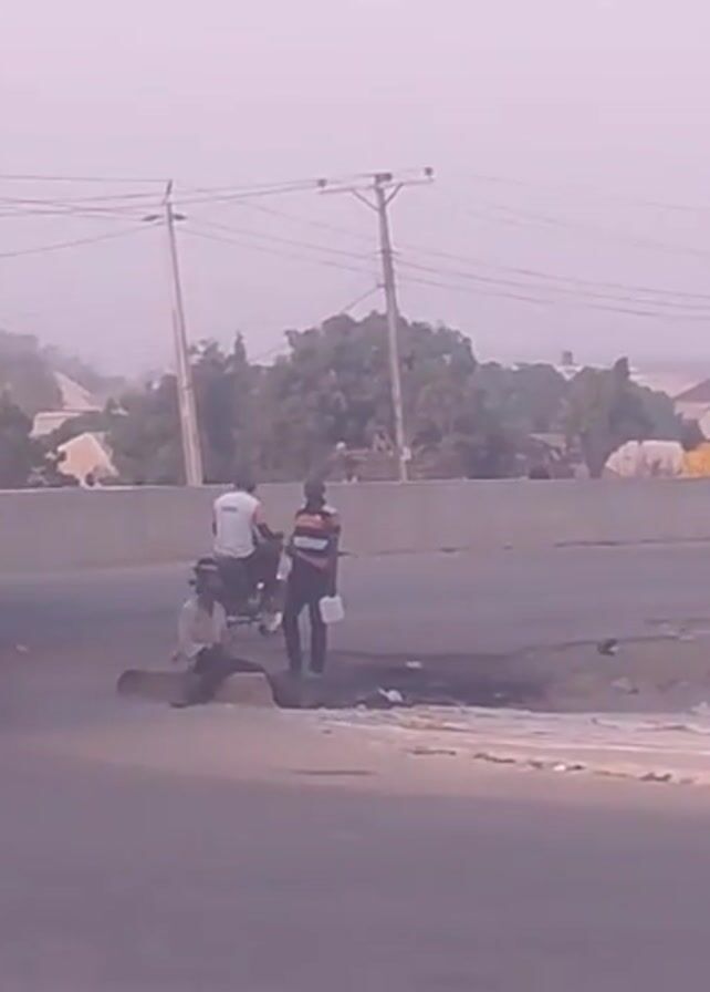scene on a roadside in a rural or suburban area. In the foreground, a large truck with the words "MUNA GODIYA" painted on its back is parked on the side of the road. There are several men near the truck, some standing and some sitting. One person is on a motorcycle that is pulling away from the group. A white van with a red logo drives past in the opposite direction. In the background, there are trees, buildings, and power lines. The sky is overcast, and the air appears hazy.