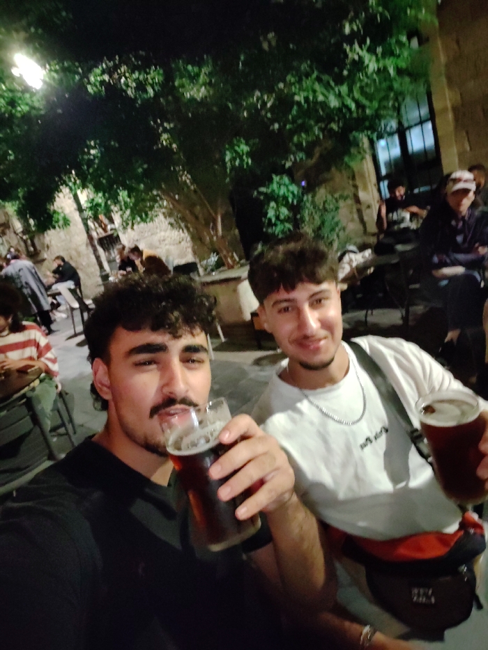 The image depicts two males in the foreground, holding glasses of dark beer, within an outdoor dining or bar establishment located in West Jerusalem, Israel