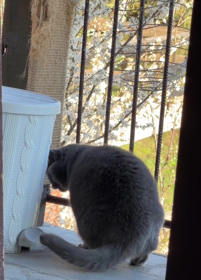 From inside an open doorway, the scene shows a grey cat standing on a stone patio. The cat is facing away from the viewer at first, then turns to look directly at the camera with yellow eyes. Behind the cat, a white trash can stands next to a scratching post. In the background, a wrought-iron railing separates the patio from a flowering tree. The lighting suggests it is daytime.