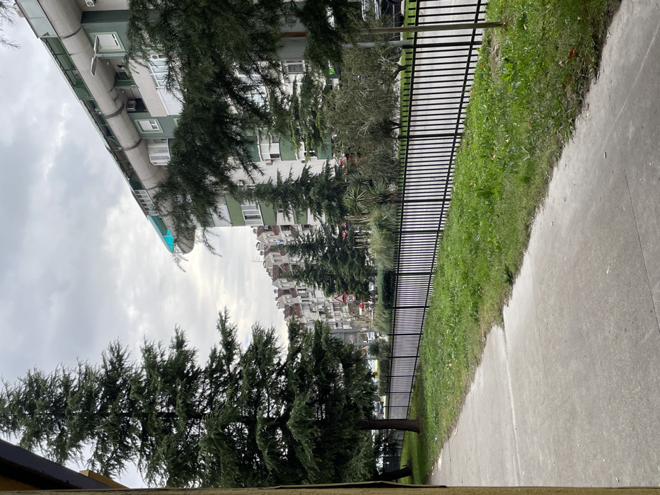 The image displays an urban streetscape in the City Kvart neighborhood of Podgorica, Montenegro, likely situated along Studentska Street. The foreground features a concrete sidewalk originating from the lower left, running parallel to a narrow strip of unkempt green grass. This grass patch is separated from the street by a black metal fence composed of vertical pickets. Beyond the fence, a tree-lined median containing various evergreen trees and dense shrubs separates the pedestrian area from a paved road. A circular red and white traffic sign indicating a "30" speed limit is visible within this median. In the background on the right, a multi-story residential building with a light green and white facade is prominent. This structure exhibits multiple levels of distinctive, rounded, cantilevered balconies, topped by an extended, glass-enclosed balcony or sunroom. Air conditioning units are visible on its exterior. To the left of this building, a series of other apartment buildings with lighter facades and characteristic pointed, tiled roof sections extends into the distance. The sky is uniformly overcast. No individuals are visible in the scene. A dark-colored vehicle is partially visible on the street in the far distance to the right.