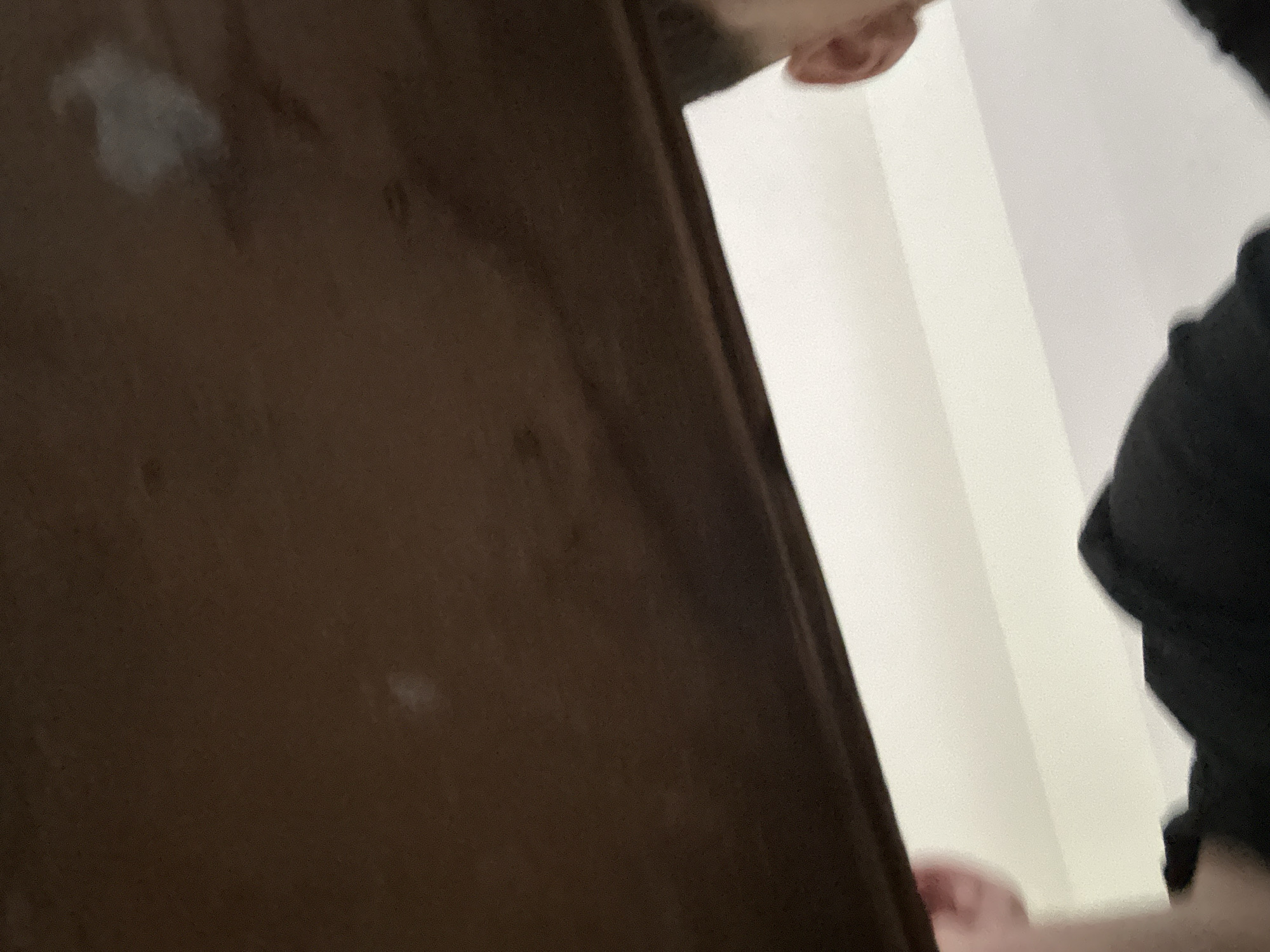 The image depicts an indoor scene from a low-angle perspective, stated to be located in Stara Zagora, Bulgaria. The upper two-thirds of the frame are dominated by a dark brown, possibly wooden or upholstered, surface, showing subtle variations in texture and some light, indistinct smudges, including a more prominent, amorphous light grey area in the upper right. Below this surface, a bright white or off-white background, likely a wall or ceiling, is visible. Partially obscured by the white background and the lower edge of the frame are human subjects. On the left, a light-skinned hand or forearm is partially visible, appearing to be in motion or blurred. In the lower right quadrant, the right ear and a portion of the right side of the face/hairline of an individual are visible, along with dark clothing, likely a shirt or jacket, below them. The lighting suggests an overhead or indirect source, illuminating the white background. No specific actions or interactions beyond the implied presence of individuals beneath the brown surface are clearly discernible.