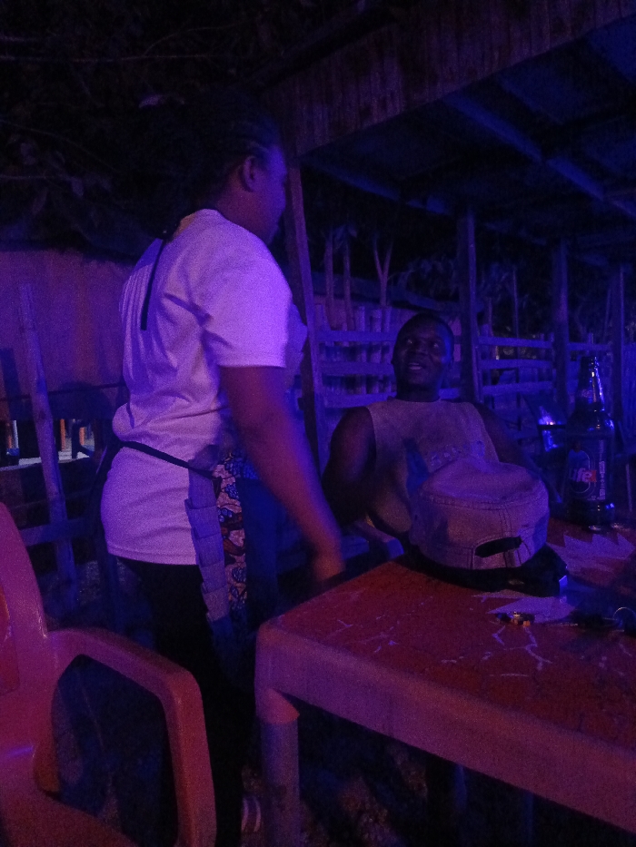 A woman in a white shirt and dark pants stands near a red plastic table, wearing an apron with colorful fabric. Seated at the table is a man in a sleeveless shirt, smiling, with a baseball cap on the table. A bottle of beer is also on the table. The setting appears to be an outdoor or semi-outdoor structure with wooden beams. The lighting is dim with a blue hue.