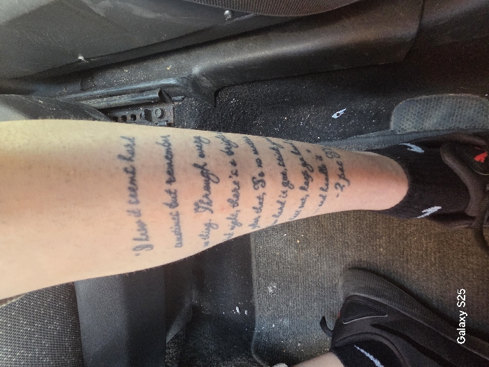 The image displays the lower leg of an individual, likely an adult, situated within the interior of a vehicle in Novo Delchevo, Bulgaria. The bare shin of the leg is extensively tattooed with black, handwritten script, which reads: "I know it seems hard sometimes but remember one thing. Through every dark night, there's a bright after that. So no matter how hard it gets, stick your heel out, keep ya head up and handle it. - 2Pac (R.I.P.)". The individual's foot is clad in a black athletic sock with a white logo visible near the ankle, and a dark-colored athletic shoe with laces and a thick sole. The immediate environment consists of a dark, possibly grey, carpeted floor on the left side of the frame, and a darker, textured plastic or rubber surface on the right. A ribbed pedal, consistent with a vehicle's accelerator or brake pedal, is partially visible at the bottom right. A section of a dark, textured fabric seat is visible in the upper left corner. The scene is illuminated by ambient light.