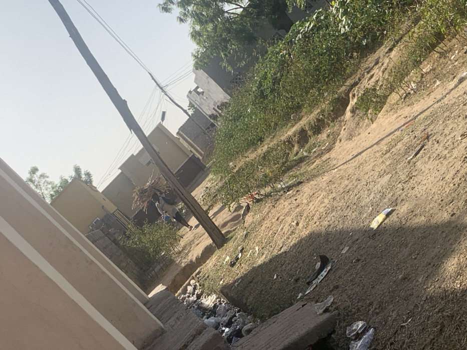 A daylight scene in Dabawa, Nigeria, depicts an unpaved, dusty urban or semi-urban environment. In the mid-ground, a solitary individual walks from left to right, carrying a substantial bundle of dry branches or sticks on their head and upper back. The person is dressed in light-colored attire. A dark utility pole with overhead power lines stands vertically near the center of the frame, slightly to the right of the individual. The terrain consists of dry, sandy earth with patches of green scrub and taller vegetation, particularly along the right side. Scattered debris, including plastic items and refuse, is visible on the ground. To the immediate left foreground, a concrete structure partially borders an area containing accumulated trash. In the background, several buildings of varying construction styles and conditions are present under a clear, bright sky. Strong shadows on the ground suggest direct sunlight. No other individuals or significant actions are observed.