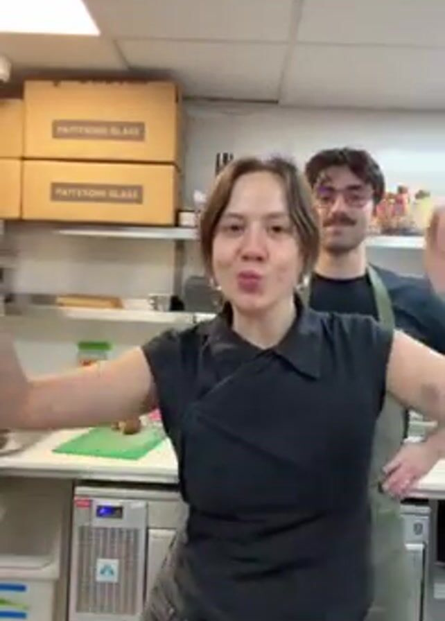 In a bright, commercial kitchen, a woman with short brown hair and a black outfit dances, mugging for the camera. She has a tattoo of a boot on her upper arm and wears an Apple watch. Behind her stands a man with dark hair, a mustache, and glasses, wearing a green apron. He smiles at the camera. The background includes stainless steel shelves, boxes labeled "Pattesons Glass," and a range of kitchen equipment. The woman strikes several playful poses, sticking her tongue out and winking.
