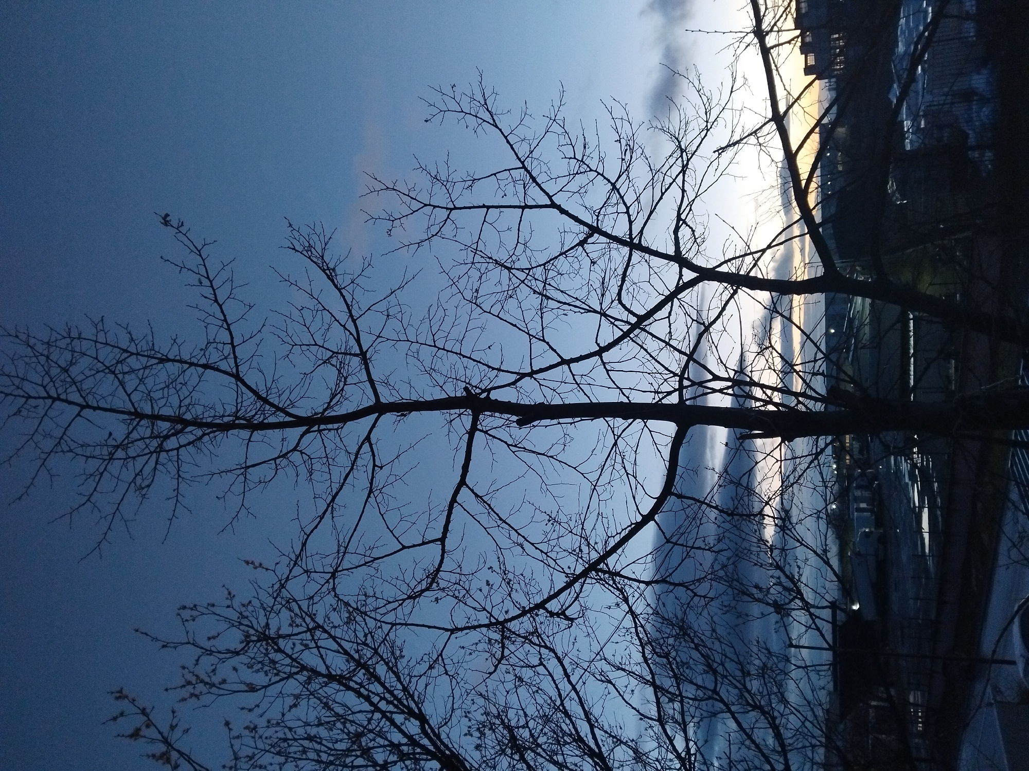 The image depicts an urban or industrial landscape in Nova Zagora, Bulgaria, at either dawn or dusk. The sky transitions from deep blue overhead to a lighter blue-grey and a pale orange band at the horizon. Dominating the foreground are the silhouetted bare branches of several deciduous trees, with a prominent central tree trunk rising vertically. Through the tree branches, the midground reveals an unpaved or partially paved lot containing multiple dark puddles reflecting the low light. A dark fence line runs horizontally across the midground. Partially visible on the lot is a large, light-colored truck, possibly a semi-trailer. In the background, several dark, low-rise buildings are visible, some with illuminated windows or exterior lights. No individuals are discernible, and no direct actions or interactions are depicted. The overall scene is static, characterized by muted tones and silhouettes against the developing or fading daylight.