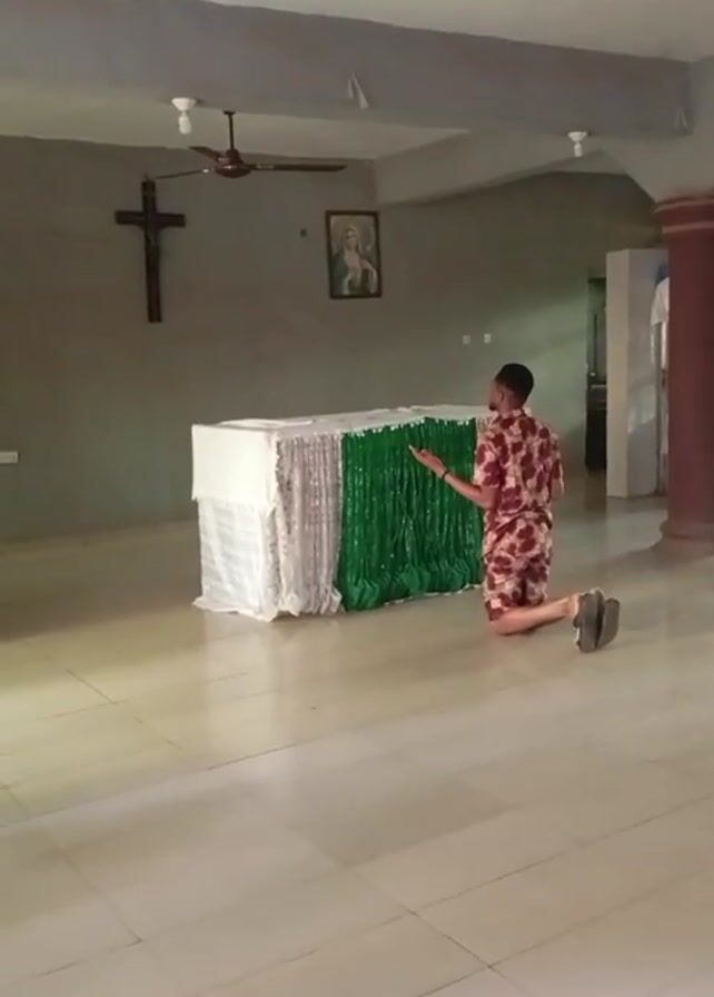 A person kneels in front of an altar in a building that appears to be a church. The person is wearing a patterned short-sleeved shirt and shorts. The altar is draped with white, silver, and green fabric. Behind the altar is a wall with a crucifix and a picture on it. The floor is tiled. The person lowers their head to the floor, appears to be praying, then rises to kneel.