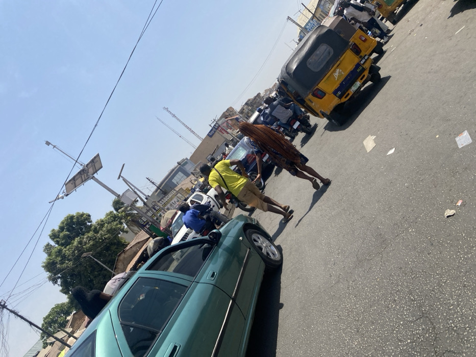 The scene depicts a busy, sunlit urban street in Maiburiji, Nigeria. The asphalt road, showing cracks and scattered debris, is populated by a mix of vehicles and pedestrians. On the left, a dark teal sedan, possibly a Peugeot 406 model, is stationary or moving slowly. A person is seated or lying partially on the roof of this vehicle, which also carries luggage. In the mid-ground, two individuals are walking on the roadway, seen from behind. One person wears a yellow t-shirt, brown shorts, and flip-flops. Adjacent is another individual with very long, reddish-brown braided hair, wearing a patterned dress, also in flip-flops. Both individuals appear to be in mid-stride or gesturing. Further down the road to the right, a yellow motorized tricycle (keke Napep) is visible amidst other vehicles, including several motorcycles and at least one white car. Pedestrians are intermingled with the traffic. Overhead, numerous utility lines crisscross a bright, clear blue sky. Tall poles support streetlights, one featuring a large solar panel array. Buildings line the street in the background, some displaying partial signage such as "ASSOCIATES" and "Royal LG". A tall, thin structure, possibly a communication tower or crane, is visible in the distant background. Strong shadows across the pavement indicate bright sunlight.