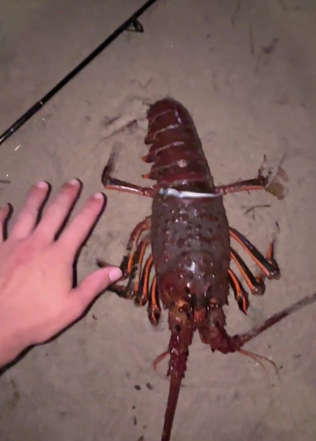 The video begins with a close-up shot of a large reddish-brown lobster lying on a sandy surface