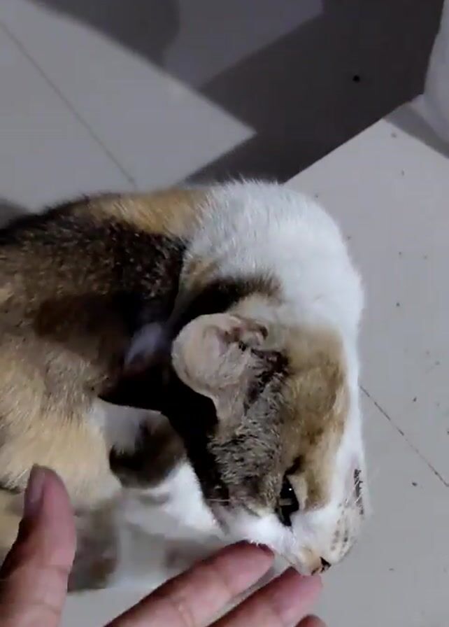 A calico cat is resting on a tiled floor, grooming itself. A person's hand reaches out and pets the cat's back. The cat then stands up and walks towards a corner of the room. The floor is gray and the walls are white. The lighting is dim.