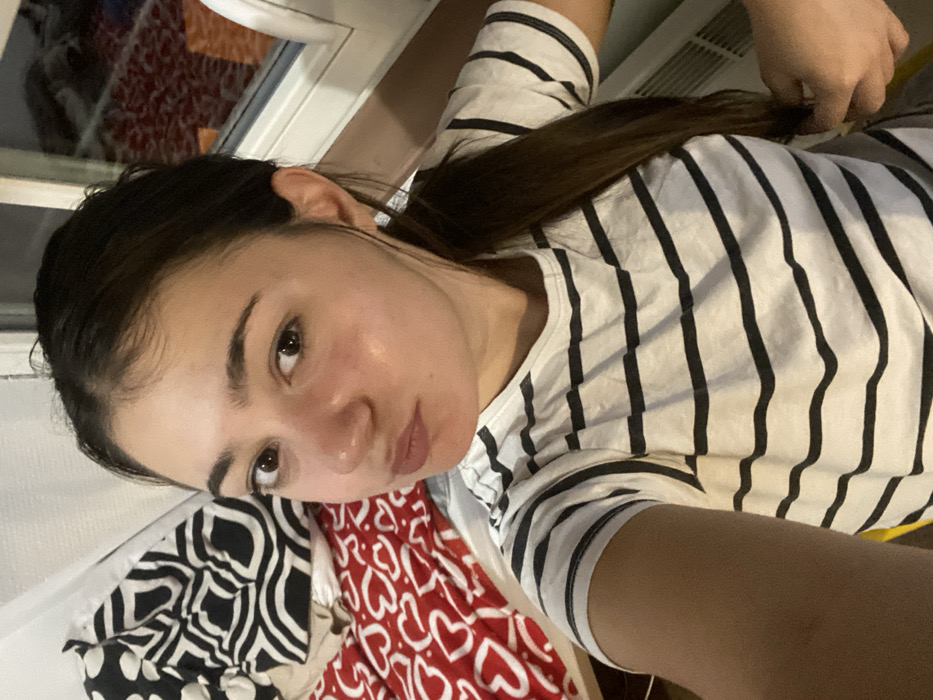 The image displays a close-up, indoor, self-portrait of a single individual, identified as female