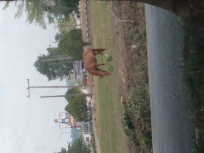 The image displays an outdoor scene in Osu, Nigeria, centered on a brown horse grazing in a grassy field