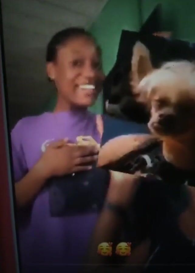 A slightly out-of-focus video displays a young woman and a small dog
