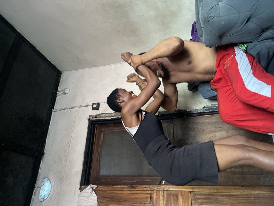 A woman in a black dress playfully grapples with a shirtless man wearing red sweatpants. Both are smiling and appear to be enjoying the interaction. The man is positioned higher, partially on a gray couch, while the woman is on a lower level, perhaps standing on a wooden surface. The scene is indoors with a black door or wall in the background.