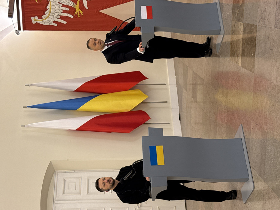 Two male individuals are depicted standing at separate podiums in a formal indoor setting, consistent with a press conference or official statement. On the left, Volodymyr Zelenskyy, dressed in a black long-sleeved shirt and black trousers, stands behind a grey podium adorned with a Ukrainian flag insignia. An earpiece is visible in his right ear, and he has a lapel microphone. On the right, a man wearing a dark suit, white shirt, and red tie stands behind a similar grey podium, which displays a Polish flag insignia. A microphone is positioned on his podium. The background features a light-colored wall. Centrally, three full-sized flags are displayed: two Polish flags (white over red) flank a single Ukrainian flag (blue over yellow). To the far right, a large red banner featuring the white crowned eagle, the coat of arms of Poland, is partially visible. The room's architecture includes a high ceiling and a large, white, paneled double door on the left side of the frame. The floor is composed of polished, light-colored square tiles. This event occurred within the Presidential Palace (Pałac Prezydencki) at Krakowskie Przedmieście 46/48, in the city of Warsaw, Poland.