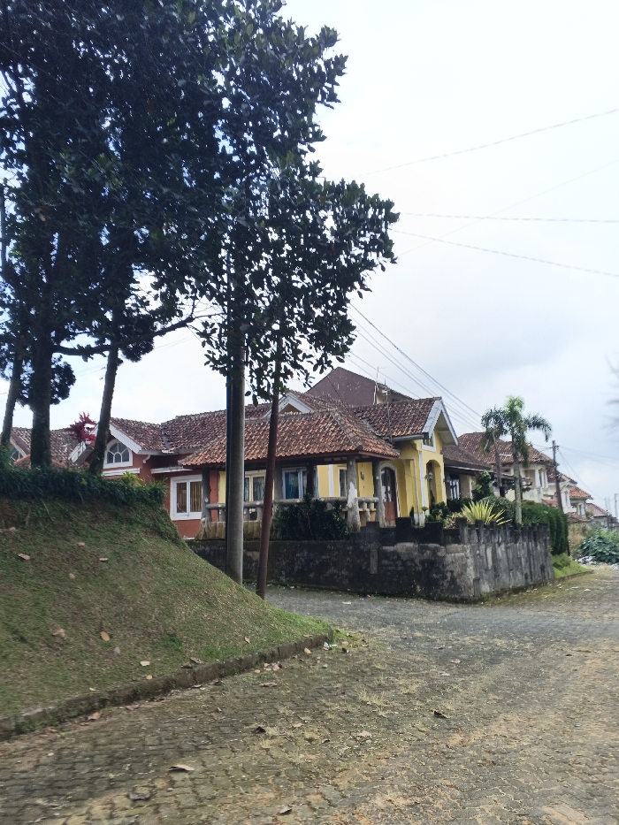 The image displays a residential street scene in the city of Unknown, Cambodia. In the foreground, a paved road, constructed from interlocking grey pavers and exhibiting scattered leaves and dirt, curves gently to the right. To the left of the road, a green, grass-covered embankment slopes upwards. The midground features a row of houses, all with prominent red terracotta tile roofs. The most prominent structure is a yellow house with a gabled entrance supported by white columns and an arched window. To its left, partially obscured by trees and the embankment, is a red house with white trim and a distinctive arched window in its upper facade. Further to the right, additional houses with similar architectural styles recede along the street. These residences are set back from the road behind a weathered grey retaining wall, which incorporates decorative, crenellated sections. Multiple tall trees with dense dark green foliage are situated on the left side of the frame, their trunks visible. A dark utility pole stands centrally, supporting a network of overhead power lines that traverse the upper portion of the image. A palm tree and various shrubs are visible around the houses. The sky is overcast and light grey. No individuals, vehicles, or animals are present in the scene.