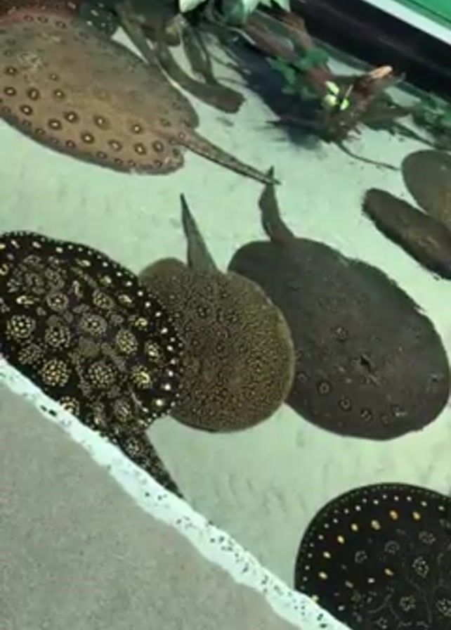 A close-up shot captures several stingrays resting on a sandy bottom in an aquarium. The stingrays exhibit various colors and patterns, including black with yellow spots and brown with darker spots. A few decorations, like plants and driftwood, are scattered within the aquarium environment. The camera angle offers a view from above, looking down into the clear water.