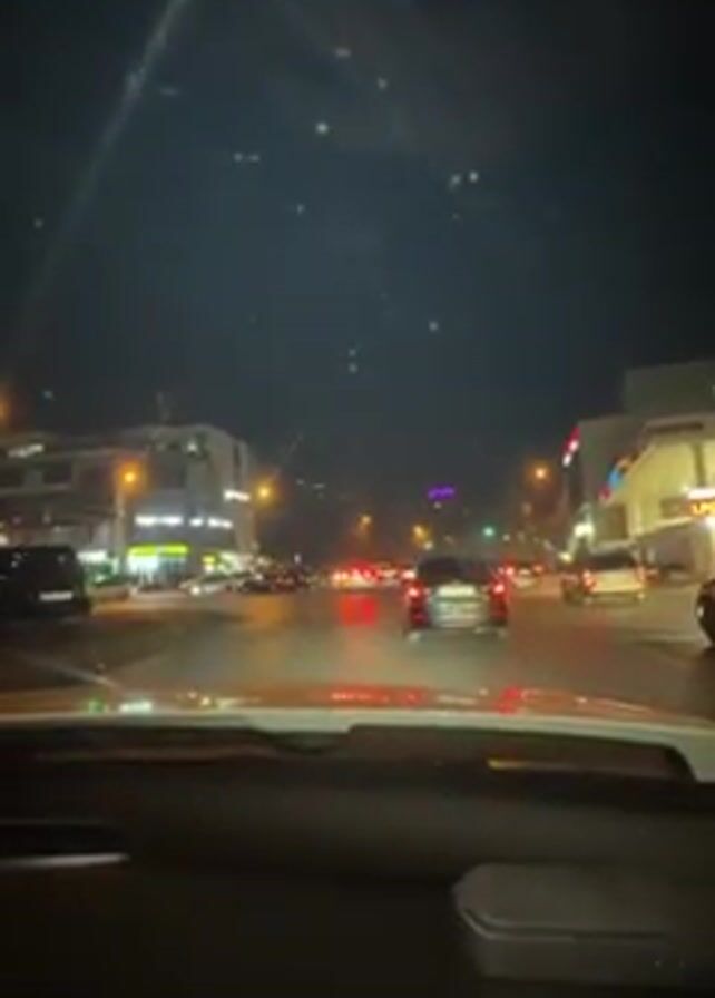 view from inside a car driving through a city street at night. There are other cars on the road with headlights and tail lights visible. Streetlights illuminate the buildings and surroundings. The sky is dark, and there appear to be some reflections on the windshield. The camera remains static, capturing the movement of the car through traffic.