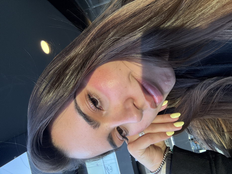 A close-up image captures a female subject with long, dark brown hair and light skin, posing indoors in San Bernardino Tlaxcalancingo, Mexico. Direct sunlight from the subject's right illuminates her face and hair, creating highlights on her right cheek and casting a shadow across her left side. She wears a dark long-sleeved garment. Her left hand, adorned with short, yellow-painted fingernails, a silver ring displaying Roman numerals, and a silver beaded bracelet, supports her jawline. Her eyes are directed towards the camera, and her lips are slightly parted. Makeup includes prominent pink blush on her right cheek and visible eyelashes. The blurred background features a dark ceiling with a circular recessed light fixture and a glass surface with faint white markings.