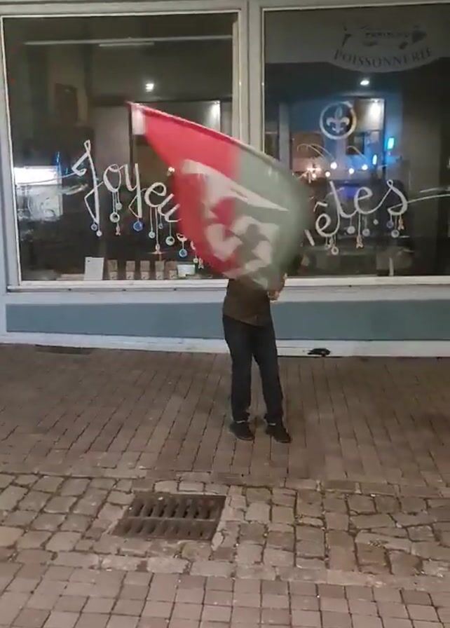 A man stands outside of a storefront on a cobblestone sidewalk, spinning a flag with the word "PIZZA" printed on it. The man is wearing a dark shirt, dark pants, and a black baseball cap. He is smiling and looking directly at the camera. The storefront behind him has "Joyeuses Fêtes" written on the window, along with an advertisement for "tous les produits de la mer," which translates to "all seafood products." The building behind the man is illuminated by indoor lighting.