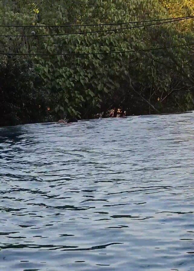The camera is oriented vertically and is focused on a swimming pool and its surrounding environment. A person's body is visible in the pool, appearing to swim across. Lush green trees and a hill are present in the background. The pool water reflects the sunlight, creating ripples and patterns on the surface.