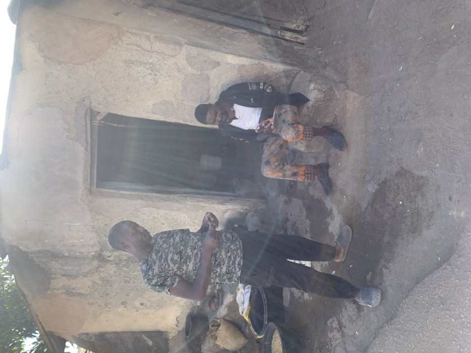 Two men are positioned in front of a weathered structure. The man in the foreground, wearing a camouflage shirt and dark pants, stands with hands together. Above him, the other man sits in the doorway; he is clad in a white shirt, patterned trousers, and a black jacket. Below the first man are several sacks and buckets. The building behind the men shows signs of age and discoloration. The scene is bathed in strong natural light.