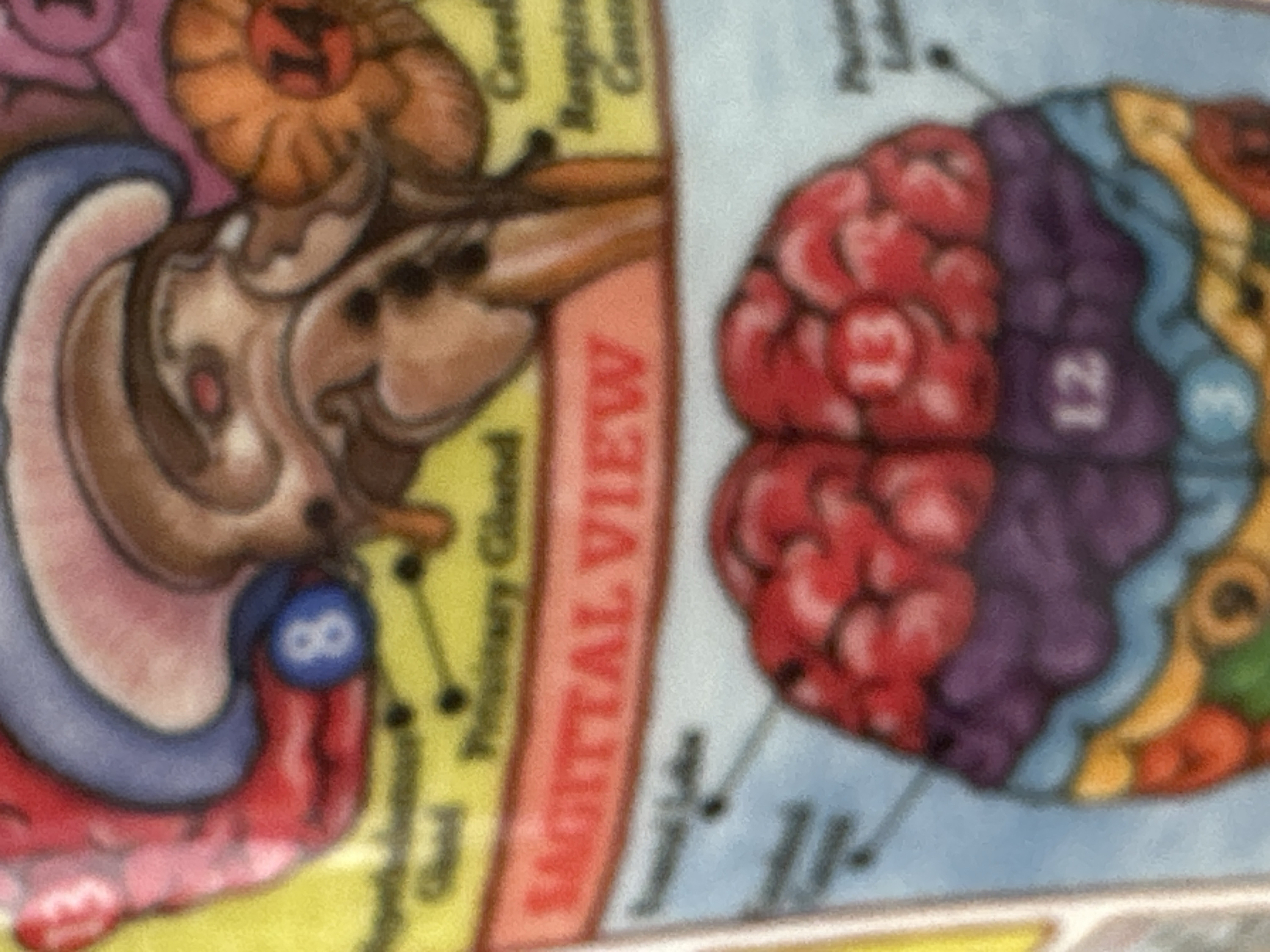The image displays a close-up, vertical view of a colorful anatomical diagram of the human brain