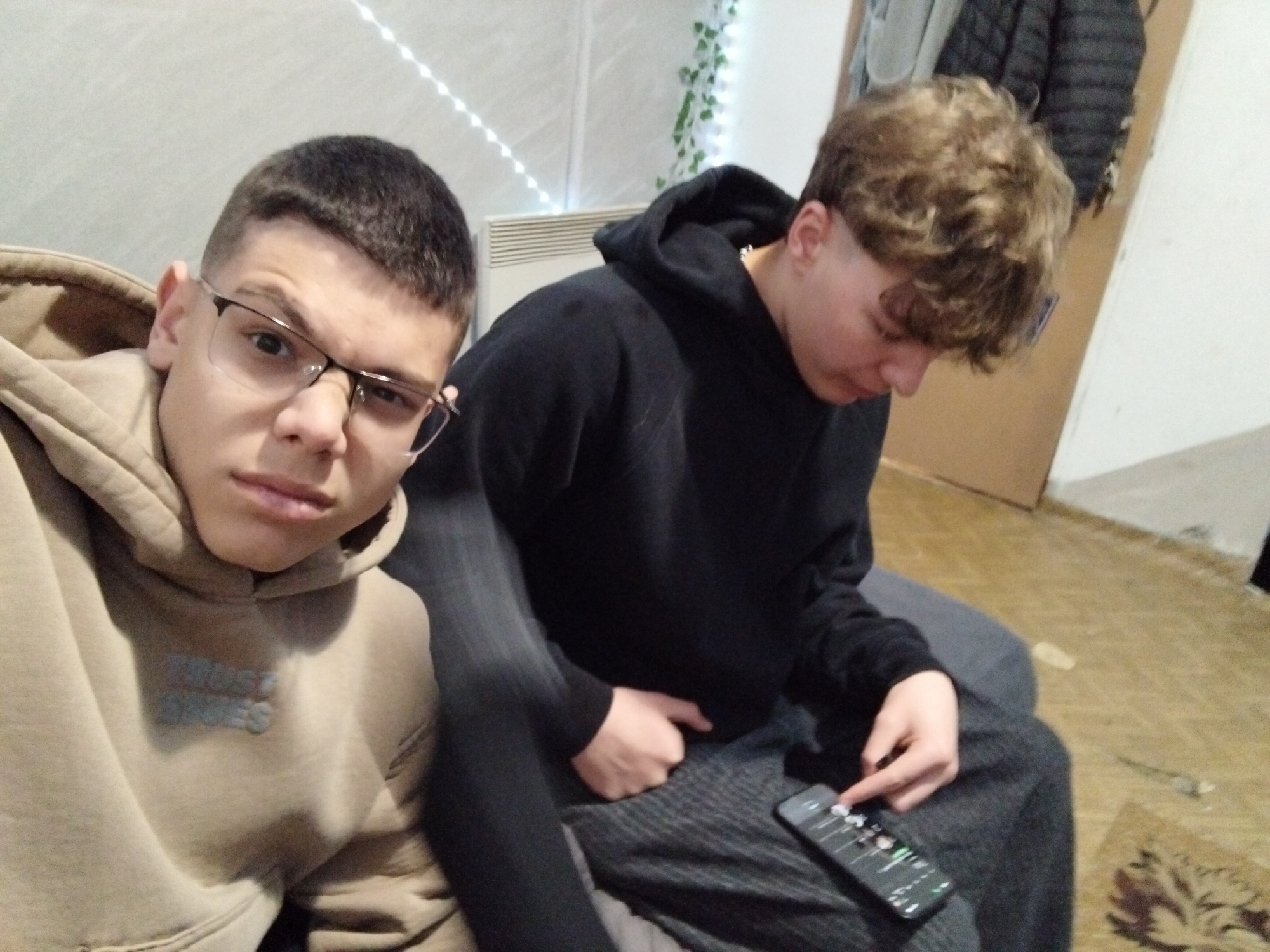 The scene depicts two young males indoors, located in the city of Troyan, Bulgaria. The male on the left, positioned closer to the camera, has short dark hair and wears dark-framed eyeglasses and a light brown hooded sweatshirt with faded text on the chest. He looks directly forward. The male on the right, with curly light brown hair, wears a black hooded sweatshirt, a silver-colored neck chain, and dark grey pants. He is observed looking downward, actively using a black smartphone held in his hands. The background features light-colored walls, a white panel radiator, and a string of decorative white lights accompanied by an artificial green vine. A dark, possibly padded jacket and another lighter garment hang on a wall or door in the upper right quadrant. The floor is light brown, with a small, dark-patterned rug partially visible in the lower right corner.