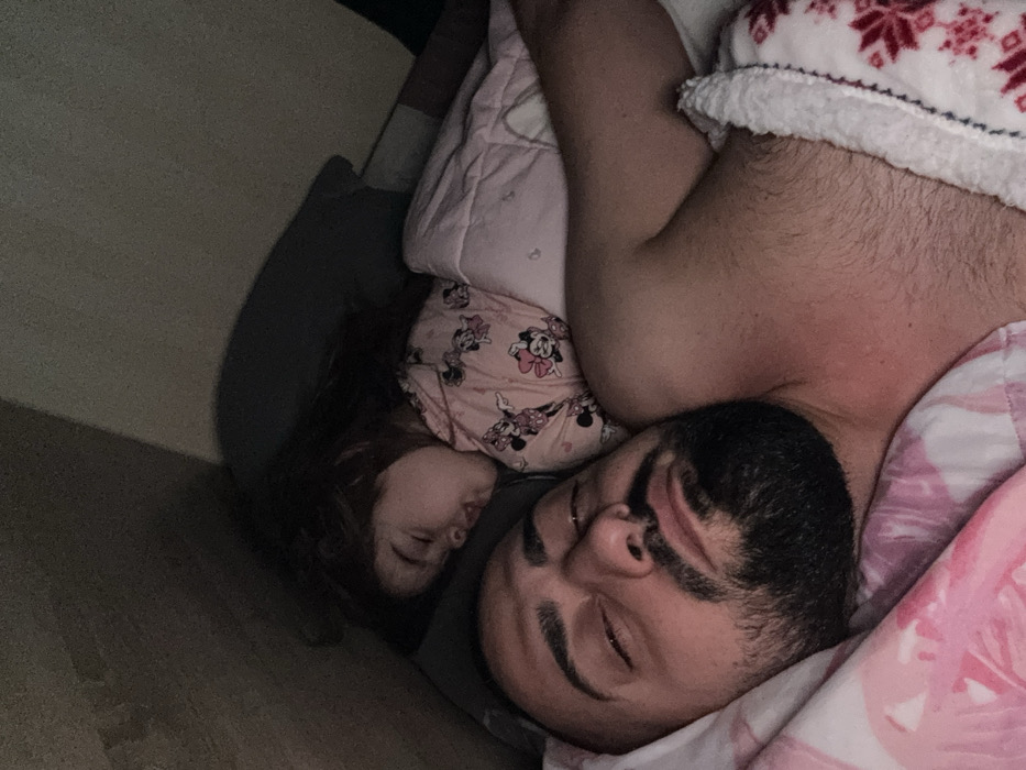 A man and a child lie asleep in bed. The man has a beard and dark eyebrows, with a white and pink floral patterned blanket covering part of his chest. The child, wearing pink Minnie Mouse pajamas, nestles near him with their head resting on a gray pillow. A white blanket with a red snowflake pattern covers a portion of the scene. The photo is taken at a slightly angled downward perspective. The bed is against a wall with dark lighting.