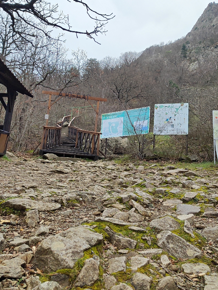 The image depicts an entrance to a natural area, likely a hiking trail or reserve, identified by an archway sign reading "В’Ю-САЙ" (V'YU-SAY), situated in V'yu-Say, near Generali, Alushta region, Crimea, Ukraine. The scene is observed from a low angle, looking upwards towards a mountainous forested landscape under an overcast sky. In the immediate foreground, a path composed of irregularly shaped grey and brown rocks and stones covers the ground, interspersed with patches of bright green moss and scattered dry leaves. This rocky terrain extends towards the midground. In the midground, a rustic wooden archway, stained dark brown, spans the path. The archway features a horizontal wooden beam with the Cyrillic text "В’Ю-САЙ" carved or painted in light green. Beneath the archway, a wooden bridge or staircase with dark brown wooden railings ascends gently into the background. To the left of the archway, a portion of a brown wooden shelter or kiosk with a sloped roof is visible. To the right of the archway, three large rectangular information boards stand upright on posts. The leftmost board is predominantly light blue with white text and a map, also labeled "В’Ю-САЙ" at the top. The central board is mostly white, exhibiting significant wear with peeling paint, obscuring its original content. The rightmost board is partially visible, appearing similar in size to the others. The background consists of a dense deciduous forest with trees largely devoid of leaves, indicating late autumn or early spring. This forest covers the lower slopes of a steep, rugged mountain face characterized by exposed grey rock formations. Scattered evergreen conifers are visible on the mountain slopes. The sky above is uniformly grey and overcast. No people or animals are present in the scene.