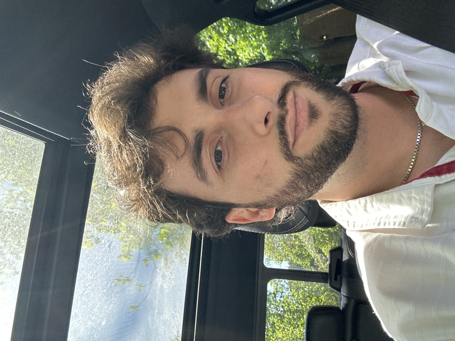 A single male individual is depicted in a close-up, chest-up shot from within a vehicle in Lo Barnechea, Chile. The subject, appearing to be in his 20s to 30s, has medium-dark, curly hair, a full beard, and a mustache. He has brown eyes, a faint linear scar on his left cheek (viewer's right), and a small, silver-colored stud piercing on his left nostril. He is wearing a light-colored, possibly off-white, collared shirt with the top buttons undone, revealing a dark red undershirt or lanyard and a silver-colored box chain necklace. A black seatbelt diagonally crosses his chest. The vehicle's dark interior is partially visible, including a rear headrest behind his left shoulder. Above, through the vehicle's sunroof, a bright blue sky and vibrant green tree foliage are visible, indicating an outdoor, daytime setting. The sunroof glass shows light surface particulates. The individual is looking directly at the camera with a neutral to slightly smiling expression.