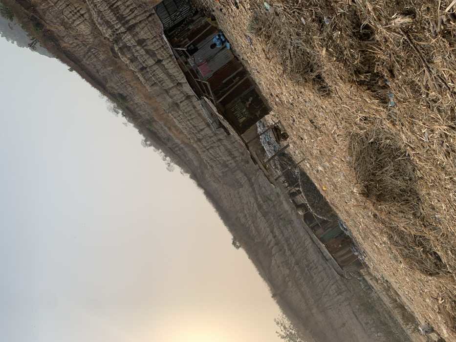A landscape with a geological formation resembling a cliff face. Structures are built into the cliff, suggesting human inhabitation. Adjacent is dry, straw-like vegetation. The sky is overcast, with the sun low on the horizon, casting a diffused light. The scene has a gritty, possibly impoverished, quality.