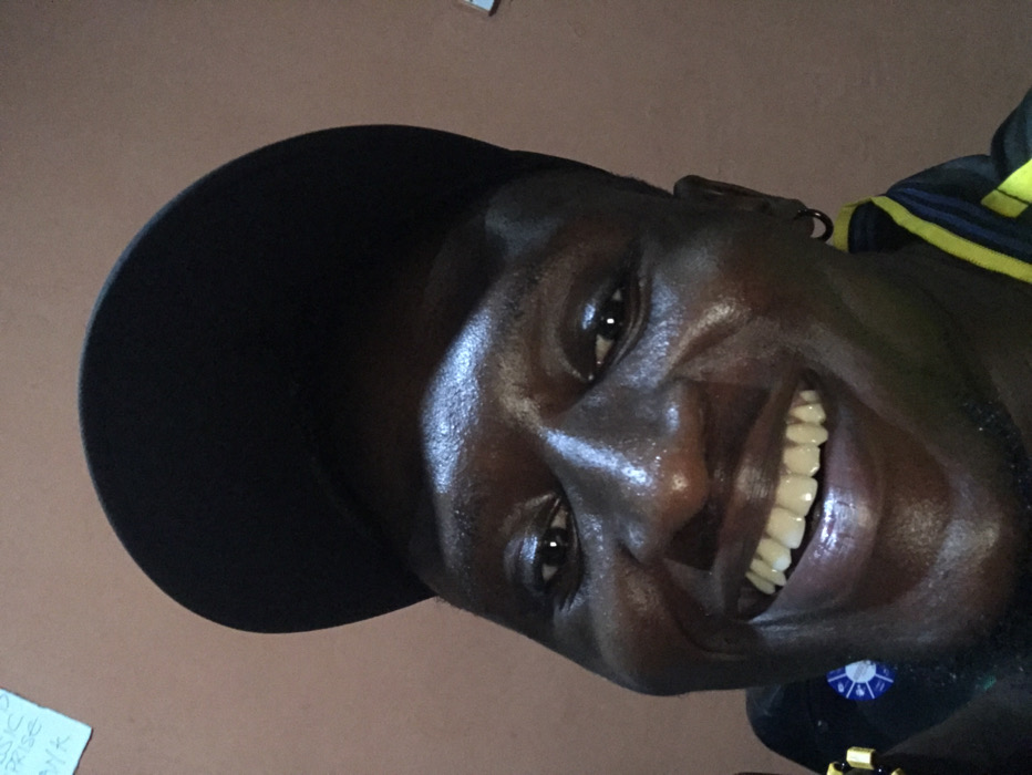 The image depicts a close-up, angled portrait of an adult male in an indoor setting. The specified location is Agege, Nigeria. The subject, possessing a dark skin tone, is smiling broadly, revealing upper and lower white teeth. His dark eyes are partially squinted, and his face exhibits prominent highlights, indicative of direct lighting. He wears a plain black baseball cap with the brim facing forward. A black hoop earring is visible in his right earlobe. On the left side of the frame, near his shoulder, a circular blue and white badge or pin is visible, along with yellow beaded strands. His attire, partially visible on the right, appears to be a black garment with yellow and green striped detailing. The background consists of a plain, light brown or ochre-colored wall. In the upper left corner of the background, a small white piece of paper, possibly a note, is affixed to the wall, displaying faint handwritten text including "MUSIC" and "PRISE".