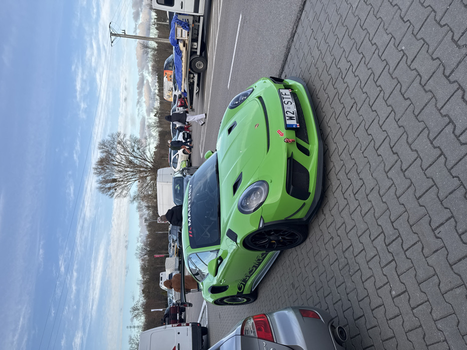 This image depicts a daylight scene in a paved parking area in Wolica, Poland. The primary subject is a bright lime green Porsche 911 GT3 RS MR, prominently parked and angled towards the left. The vehicle features black multi-spoke wheels, a large rear wing, and a front splitter with a visible red tow strap. A "Manthey" banner is displayed on its windshield, and "GT3RS MR" decals are present on its side skirts. The front license plate reads "W2 STF", indicating a Polish registration. To the immediate left of the Porsche, the rear section of a silver sedan is partially visible. In the background, numerous vehicles are parked across the grey interlocking paver lot, including a white panel van, a dark SUV, and various other cars. Several individuals are present in the background; one person in a brown hooded jacket stands near the rear of the green Porsche, while others are seen walking or standing further back among the parked vehicles. On the right, a white flatbed tow truck is parked, carrying a load covered by a blue tarp and secured with wooden pallets. An individual in white pants and a dark top is seen walking past this tow truck. The background features a treeline of bare deciduous trees, with a prominent large, leafless tree in the center. Utility poles and overhead power lines are visible against a partly cloudy sky. The paved area transitions into an asphalt road on the right side of the frame.