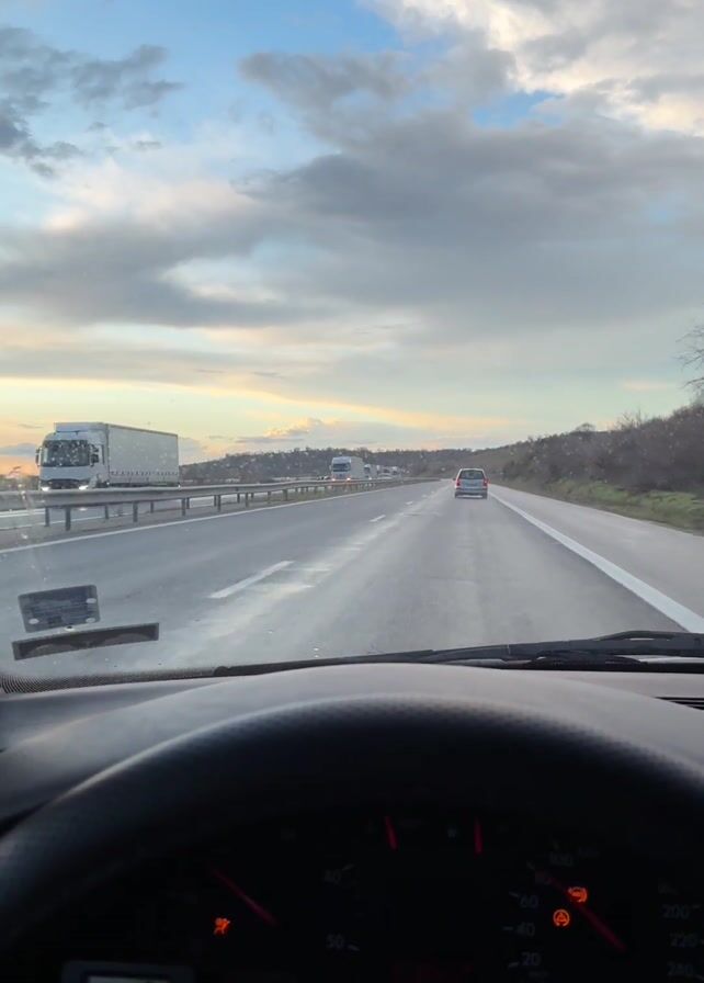 From the driver's seat of a car, the video shows a view of a highway with a white truck and a silver car ahead