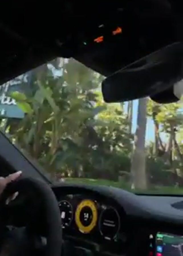 From the driver's seat of a car, the video shows a view of the road ahead, which is lined with tall palm trees. The sign for The Beverly Hills Hotel is visible on the right. A person's hands can be seen on the steering wheel. The car's dashboard is visible, showing the speedometer and navigation screen. It is daytime, and the sky is blue.