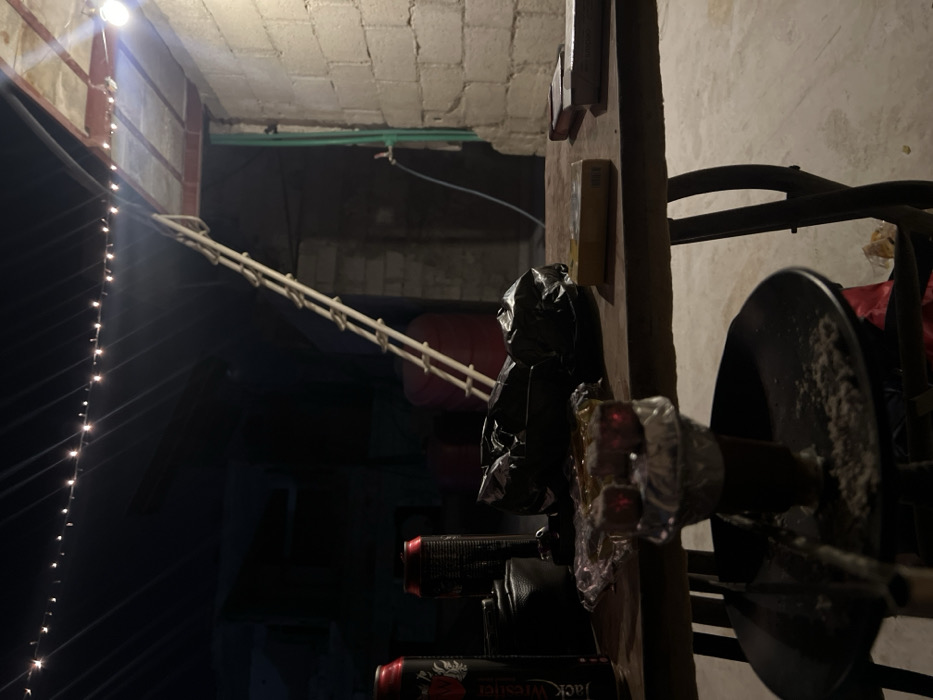 A cluttered indoor scene shows a ladder leaning against a building's structure, possibly leading to the roof. The area is dimly lit, with string lights adding a decorative element. In the foreground, a collection of cans and a black bag are visible against a wooden surface, potentially part of a storage or workspace area. A weight rack is also present. The scene evokes a sense of disorganization and perhaps a makeshift or improvised setting.