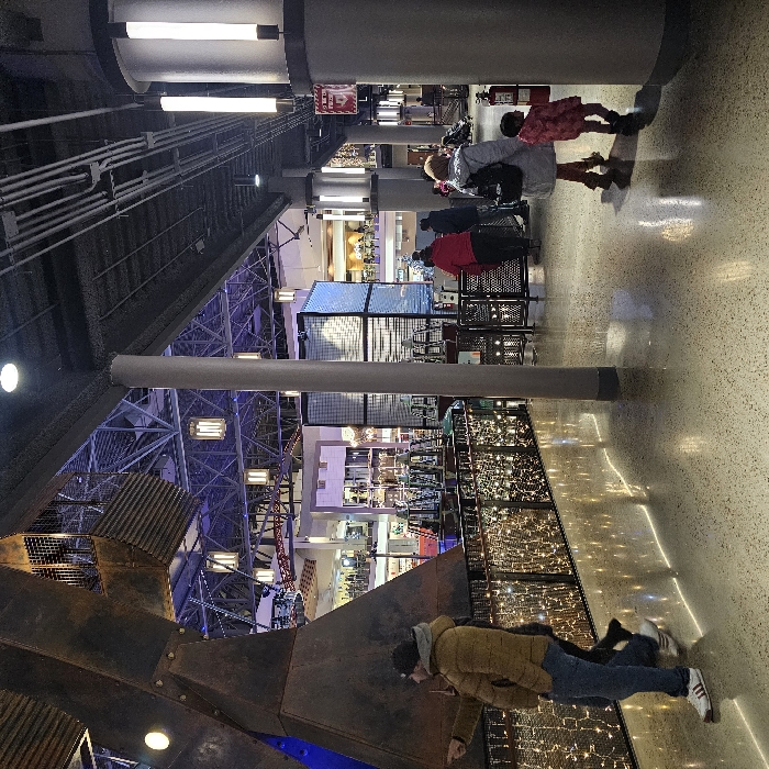 interior of a large building, possibly a mall or shopping center, from an angled perspective. Multiple levels are visible with various retail spaces and displays. Several people are present, including a family with a child wearing a pink outfit, and a man in a brown jacket and jeans near a metallic structure. The building features high ceilings with industrial-style lighting and architectural details. String lights are draped along a railing on one of the levels.