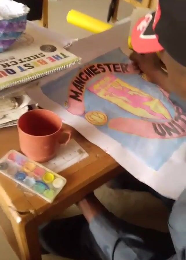 A person wearing a grey jacket and a black and red baseball cap is sitting at a wooden desk, drawing the Manchester United logo on a piece of paper. The logo is partially colored in shades of pink, yellow, and blue. On the desk are a mug, a watercolor palette, and a notebook. The room appears to be a classroom or studio, with wooden chairs and other furniture visible in the background. The person is focused on their work, carefully outlining the letters of "Manchester United".