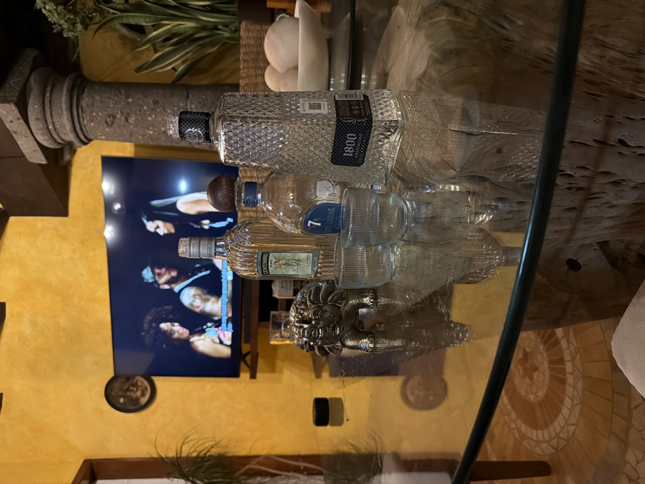 This image captures an indoor domestic scene in Cuernavaca, Mexico, likely a living or dining area, characterized by warm yellow textured walls and rustic architectural elements. In the foreground, a large, rectangular glass-top table rests on a substantial, textured wooden base. Arranged on the table, from left to right, are a small black circular object, a metallic elephant figurine with its trunk raised, two small, clear, ribbed glasses each containing a small amount of clear liquid, a clear bottle of Centenario Plata tequila with a green label, a partially visible blue-labeled bottle of 7 Leguas Blanco tequila, and a clear, faceted bottle of 1800 Cristalino tequila. The background features a large flat-screen television mounted on the yellow wall, displaying a video with three individuals: two women, one with curly hair and one with straight hair, and a man wearing a cap. Subtitles are visible at the bottom of the screen. To the left of the television, a dark, circular decorative object is affixed to the wall. To the right of the table, a thick, grey stone pillar with a rounded capital extends from the floor towards the ceiling. Behind this pillar, a woven basket contains several spherical white objects, and a tall, green snake plant (Sansevieria) is visible. The floor below the table is covered with patterned mosaic tiles featuring concentric circles and star-like designs in shades of brown and beige.